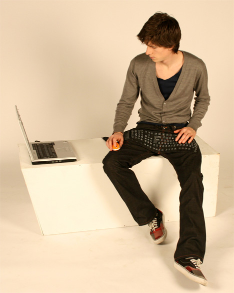 Mas nada se compara a esta novidade para o guarda-roupa geek: a calça jeans com teclado acoplado. Hã? É isso mesmo, uma coisa um tanto quanto esdrúxula que inclui um bolso especial para guardar o mouse e um controle de joystick na frente do zíper!!!