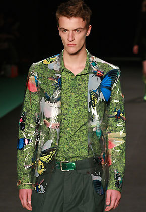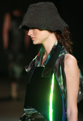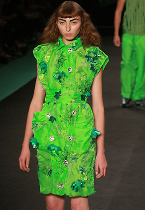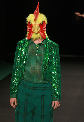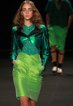 Quando a luz se acende na passarela, percebemos que três garotas flutuam no ar, levitam como num show de mágico. Entram os verdejantes looks anunciados. O espírito é o streetwear de luxo da marca, com tecidos nobres, brilhos e loucurinhas: um trench coat de plástico transparente aqui, uma calça de vinil lá, um macacão com cintura “santro-peito” acolá. Não há grandes revoluções de estilo, mas é uma roupa em sintonia com as tendências do momento (saias de cintura alta, jaquetinhas curtas, chemises, shortinhos e calças amplas), que o consumidor da marca vai gostar e usar. Adorei o toque de humor das máscaras usadas pelos modelos. Parece que Marcelo Sommer –diretor criativo contratado há 6 meses– junto com a equipe de estilo, encontrou afinal um ponto de equilíbrio entre a realidade e a fantasia.